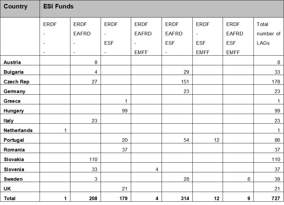 There are 3312 Local Action Groups (LAGs) in the EU (Table 1). In 15 Member States there are 727 LAGs using CLLD as an implementation mechanism for parts of their allocation of ERDF funding. The integration of multiple ESI Funds in CLLD was taken up in 16 Member States, but only one quarter of LAGs in these countries integrate multiple ESI Funds.[1]
