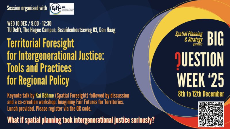 The event, Territorial Foresight for Intergenerational Justice: Tools and Practices for Sustainable Regional Policy and Planning, forms part of the Big Question Week “What if spatial planning took intergenerational justice seriously?”. It will take place on 10 December 2025, from 09.00-12.30 CET.